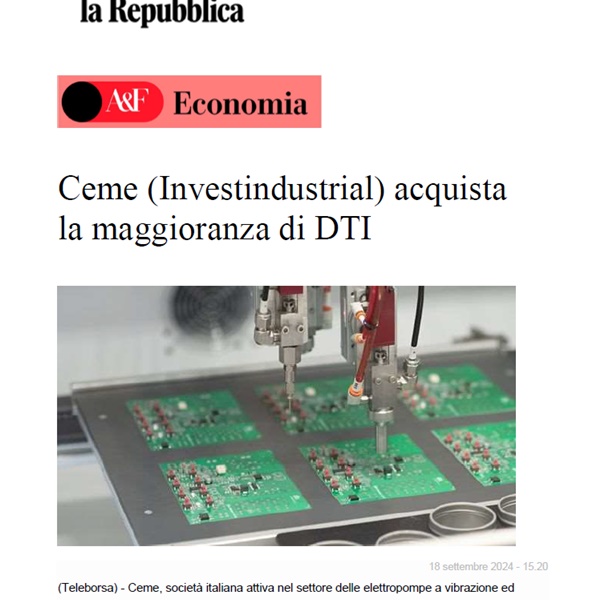La Repubblica has covered CEME Group's acquisition of DTI, emphasizing the strategic significance of this operation for advancing our market...
