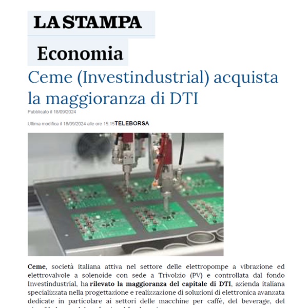 La Stampa has reported on CEME Group's acquisition of DTI, pointing out how this key move enhances our leadership position in the market. Th...