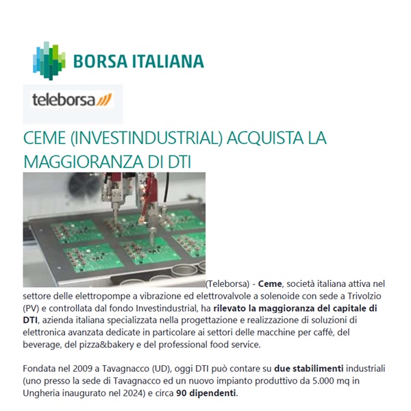 Borsa Italiana has covered CEME Group's acquisition of DTI, underlining the strategic impact of this operation on expanding our market leade...