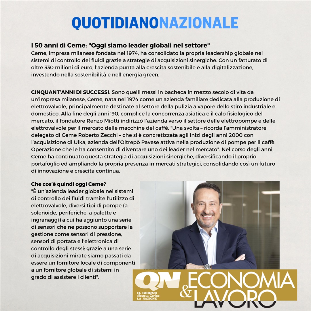 On the occasion of its 50th anniversary, CEME was featured in Quotidiano Nazionale, highlighting the company’s impressive growth and future plans. In an exclusive interview, Roberto Zecchi, CEO of the group, discussed key achievements, including surpassing €330 million in revenue and expanding to 10 global production sites. Zecchi also emphasized CEME's commitment to sustainability and digitalization, positioning the company for continuous innovation in the years ahead.