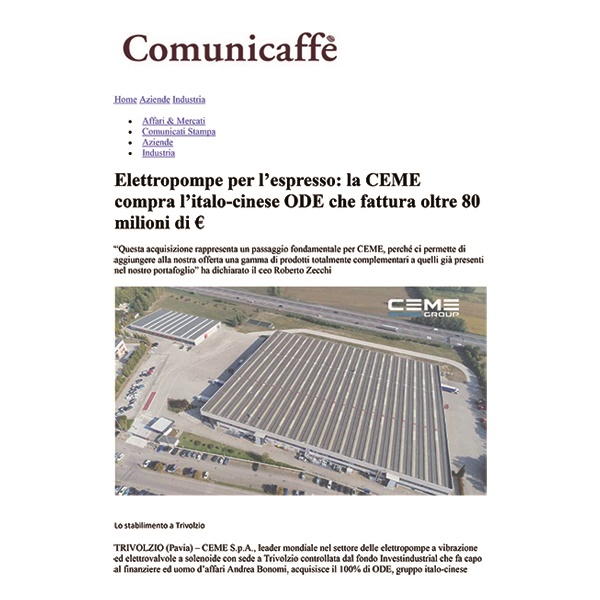 Comunicaffè published an article on the acquisition of "ODE Group" by CEME.