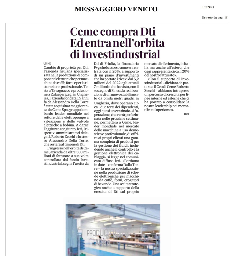 Messaggero Veneto has reported on CEME Group's acquisition of DTI, showcasing the crucial role of this strategic operation in consolidating our market leadership. This acquisition reflects our continuous dedication to innovation and expansion.